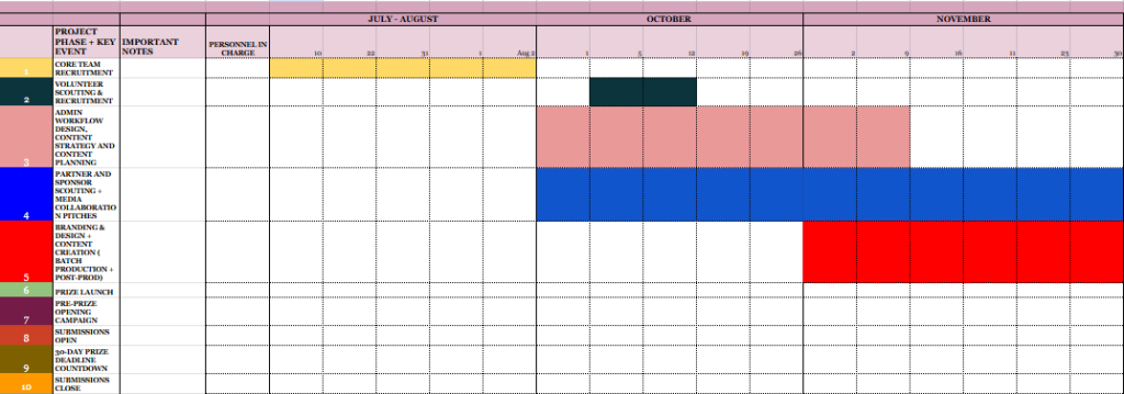 Like a wedding dress delivered a day after the marriage ceremony, organizational calendars are of no use to founders and teams if said documents are kept away in Google Docs or in a Notion workspace. I’ve found that project boards (vision boards, timelines and moodboards) affect my volunteers, partners and me with a sense of urgency when they are represented in visual formats and constantly referred to.